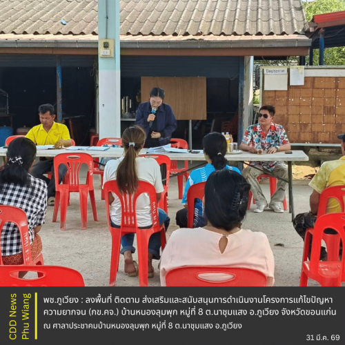 ♦️ นางพนิดา ทวีชีพ พัฒนาการอำเภอภูเวียง มอบหมาย นางสาวมณีรัตน์ จอมคำสิงห์ นักวิชาการพัฒนาชุมชนปฏิบัติการ ลงพื้นที่ติดตามการดำเนินงานโครงการแก้ไขปัญหาความยากจน (กข.คจ.) บ้านหนองลุมพุก หมู่ที่ 8 ตำบลนาชุมแสง ได้ให้ข้อแนะนำแนวทางการปฏิบัติ เพื่อให้การบริหารจัดการเงินทุนโครงการแก้ไขปัญหาความยากจน (กข.คจ.) เป็นไปตามอย่างมีประสิทธิภาพ เกิดประโยชน์สูงสุดแก่พี่น้องประชาชน และถูกต้องตามระเบียบกระทรวงมหาดไทย ว่าด้วยการบริหารและใช้จ่ายเงินโครงการแก้ไขปัญหาความยากจน พ.ศ.2553